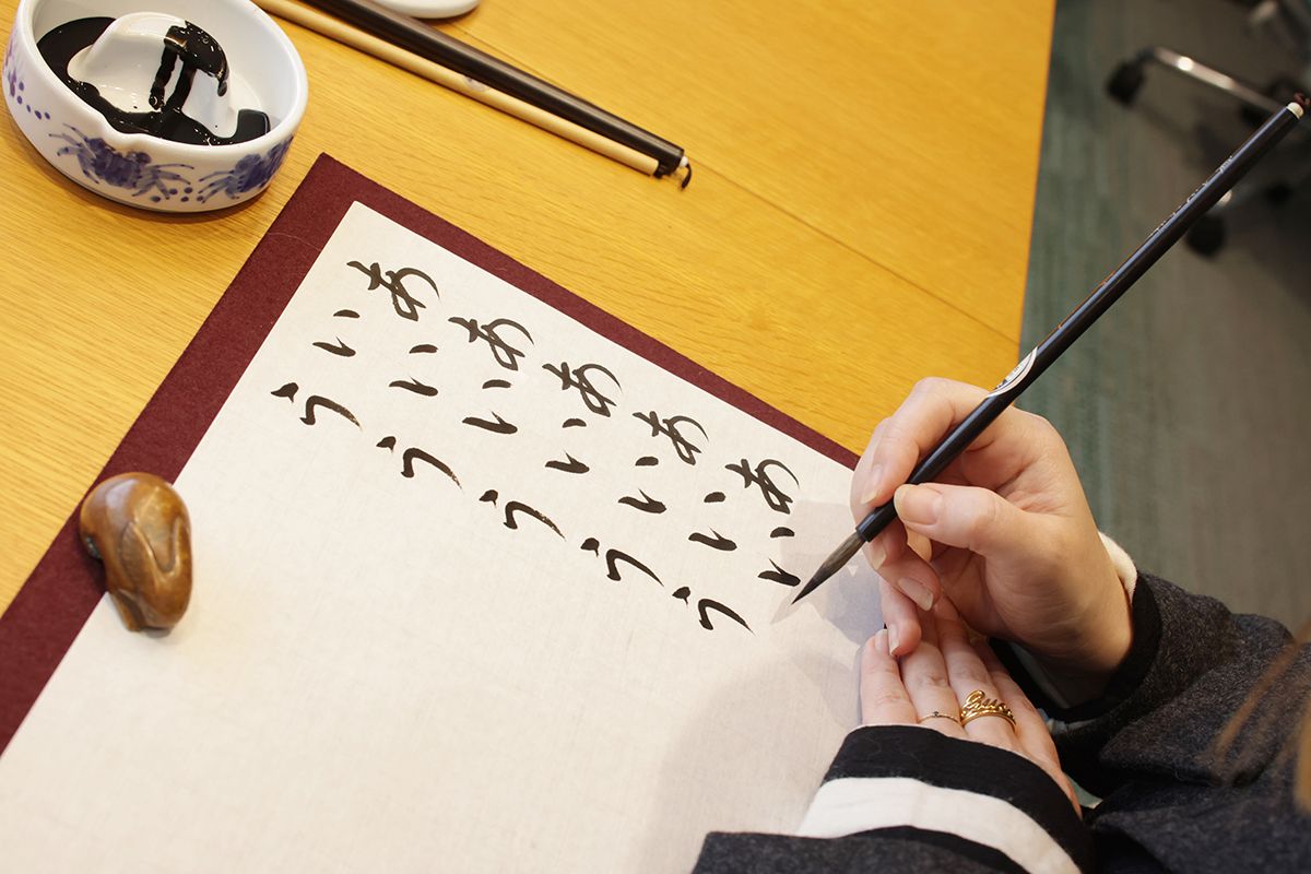 テストフォントを作るときには筆で実際に書いてみることも。少しずつバランスを変えてイメージに合う文字を探っているところ